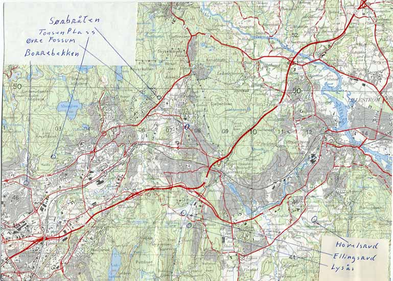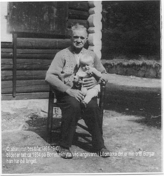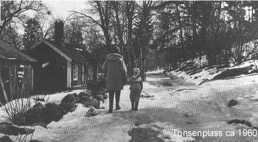 over Groruddalen Bilde nr 2.Min bestefar.(Han bygde også Borrebækhytta, beliggende ved Nordre Langevann, må ikke forveksles med Borrebækhytta som hans fetter Johan Henrik bygde ved Aurvann, begge beliggende i Lillomarka) Bilde nr 3. Sørbråten under Rommi(Blått hus midt på bildet),huset er ikke det samme som min oldefar bodde i, det er nok borte for lenge siden, men plassen er nok den samme,plassen ligger rett på oversiden av Trondhjemsveien, byggende på Romsås i bakgrunden Bilde nr 4. Dette er et bilde av Tonsenplassen, tatt i 1960. Plassen ble revet like etter. Klikk på bildene. |